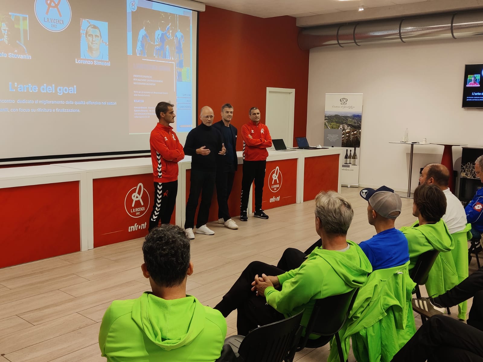 A guidare l’approfondimento tecnico sono stati due figure chiave del vivaio berico: Gabriele Stevanin, allenatore dell’Under 17, che ha illustrato strategie e principi per la finalizzazione e la costruzione dell’azione offensiva e Lorenzo Simeoni, responsabile tecnico del Settore Giovanile, che ha fornito un quadro generale sull’importanza della formazione continua e della filosofia di gioco del club. I relatori hanno messo in luce come “L’arte del gol” non sia solo frutto del talento individuale, ma il risultato di una metodologia di allenamento specifica, che cura ogni dettaglio: dalla scelta di tempo all’occupazione degli spazi, dalle combinazioni veloci alla gestione della pressione difensiva avversaria.