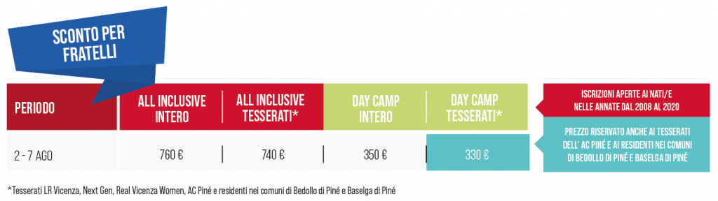 Sull’Altopiano di Piné, a pochi chilometri da Trento, paesaggi mozzafiato e laghi cristallini faranno da cornice a questa nuovissima location, già teatro del ritiro estivo della prima squadra. In doppia formula All Inclusive e Day Camp, da domenica 2 a venerdì 7 agosto, con gli istruttori del Settore Giovanile di LR Vicenza.