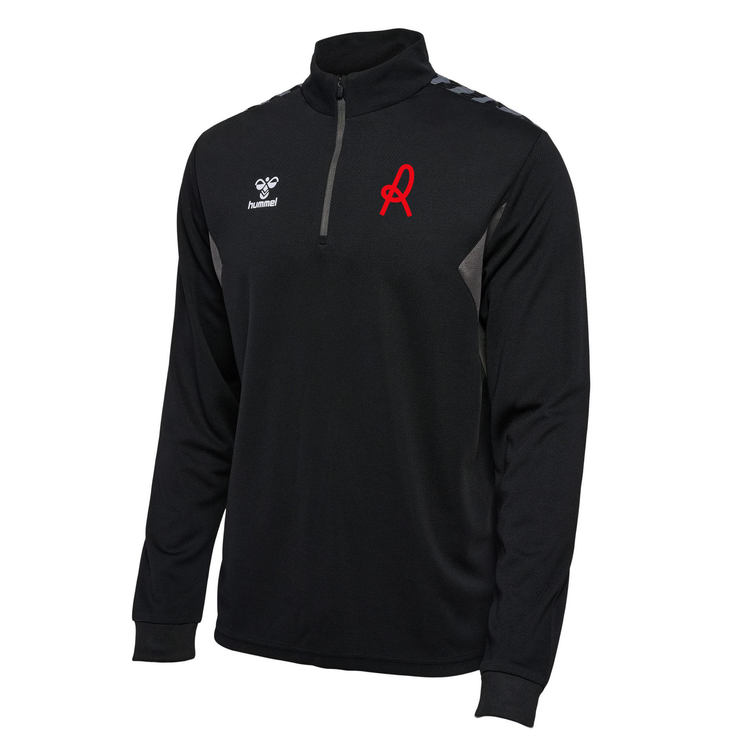 Questa felpa allenamento nera con mezza zip della Hummel è realizzata con una una maglia jacquard e tessuto 100% riciclato. La mezza zip è dotata di una custodia per cerniera in 2 pezzi per prevenire irritazioni, mentre i polsini a costine aderiscono al polso senza stringere e tengono ferme le maniche, sulle spalle è presente il caratteristico nastro Hummel a zig zag. A destra il logo Hummel mentre a sinistra è applicata la R rossa gommata.